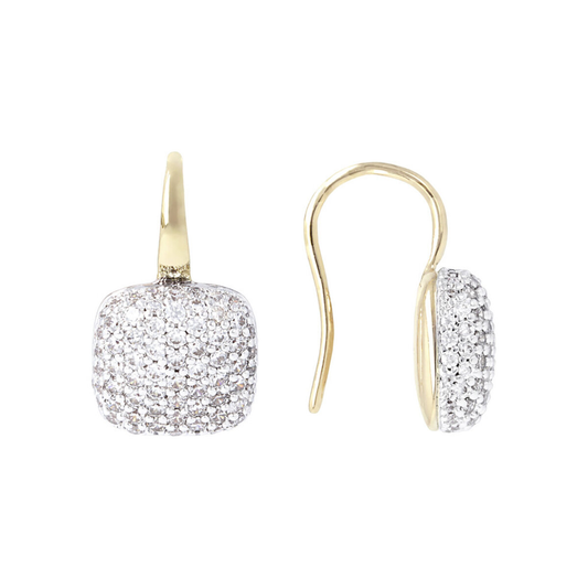 Golden Square Pendant Earrings with Pavé in Cubic Zirconia