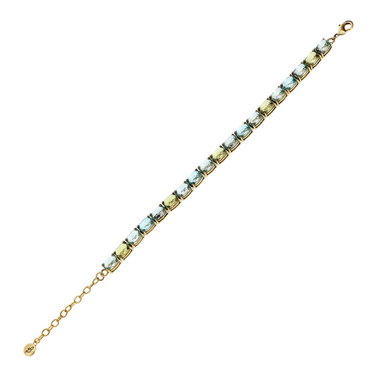 Golden Tennis Bracelet with Green and Blue Prisma Gem in Mosaic Cut