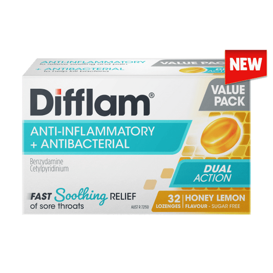 Difflam Sore Throat Lozenge Dual Action Honey & Lemon Flavour Value Pack 32 Lozenges