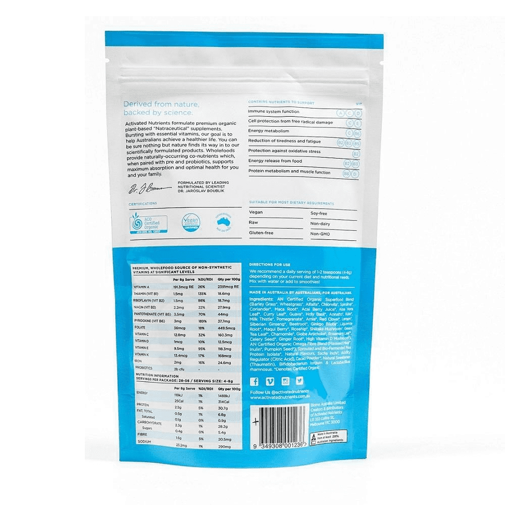 - Ingredients : AN Certified Organic Superfood Blend (Barley Grass*, Wheatgrass*, Alfalfa*, Chlorella*, Spirulina*, Coriander*, Maca Root*, Acai Berry Juice*, Aloe Vera Leaf*, Curry Leaf*, Guava*, Holy Basil*, Annatto*, Kale*, Milk Thistle*, Pomegranate*, Amla*, Red Clover*, Lemon*, Siberian Ginseng*, Beetroot*, Ginkgo Biloba*, Liquorice Root*, Maqui Berry*, Rosehip*, Shiitake Mushroom*, Green Tea Leaf*, Chamomile*, Globe Artichoke*, Rosemary Leaf*, Celery Seed*, Ginger Root*, High Vitamin D Mushroom*), AN Certified Organic Omega Fibre Blend (Flaxseed Meal*, Inulin*, Pumpkin Seed*), Sprouted and Bio-Fermented Pea Protein Isolate*, Natural Flavours, Sacha Inchi*, Acidity Regulator (Citric Acid), Cacao Powder*, Natural Sweetener (Thaumatin), Bifidobacterium longum & Lactobacillus rhamnosus