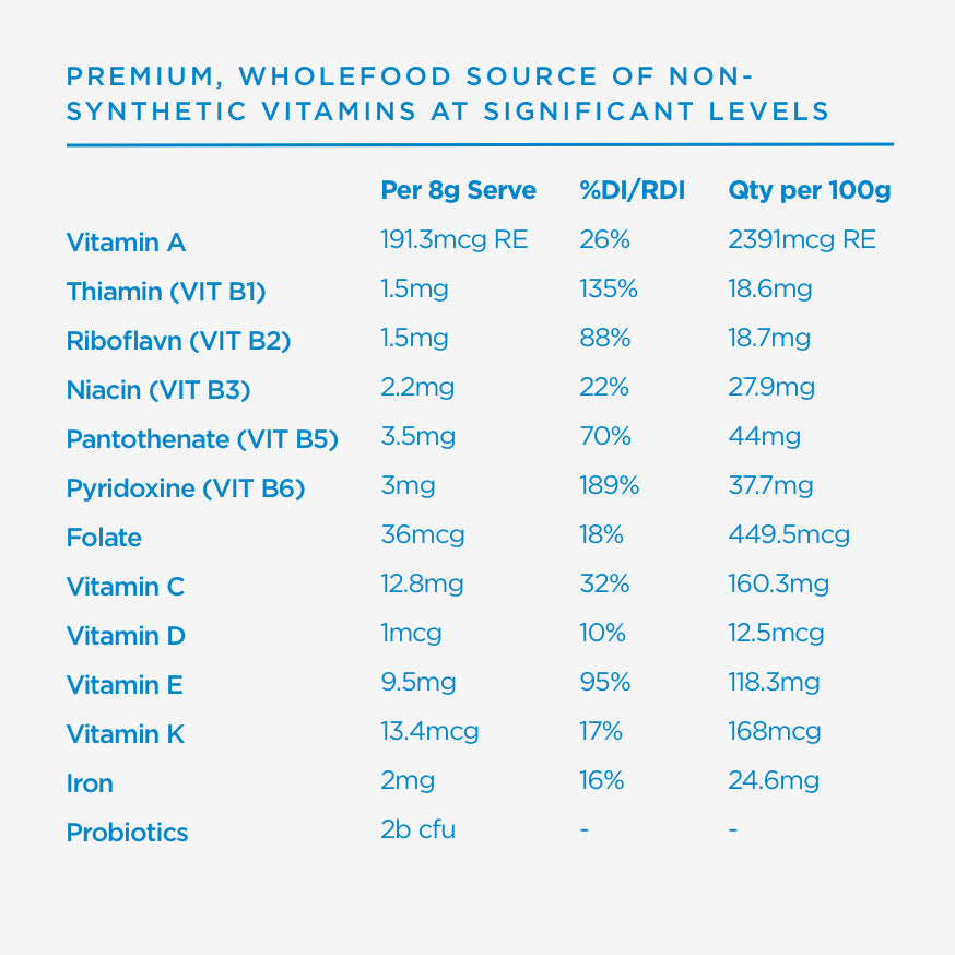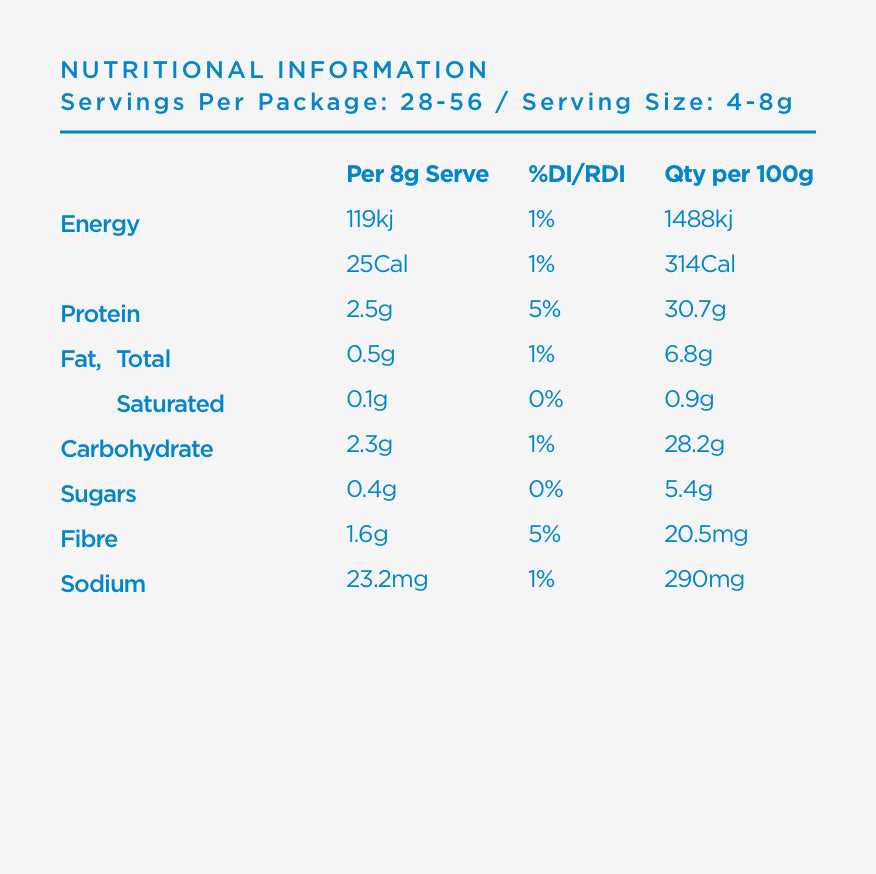 *denotes Certified Organic. - We recommend a daily serving of 1-2 teaspoons (4-8g) depending on the quality of your current diet and nutritional needs. Mix with water, or add to smoothies for a nutrient boost.