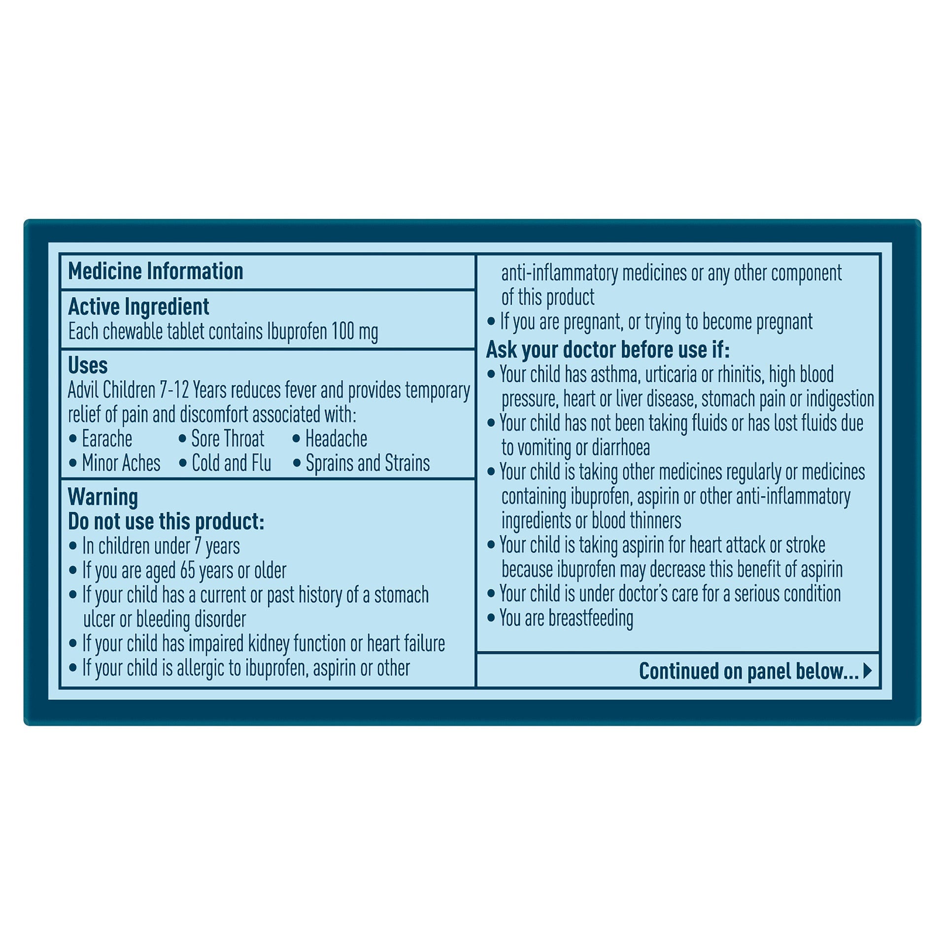 Advil Pain & Fever Relief Children's Chewable is a great tasting raspberry flavoured tablet for children aged 7-12 years. This convenient chewable reduces fever for up to 8 hours and also provides relief of pain and discomfort associated with: