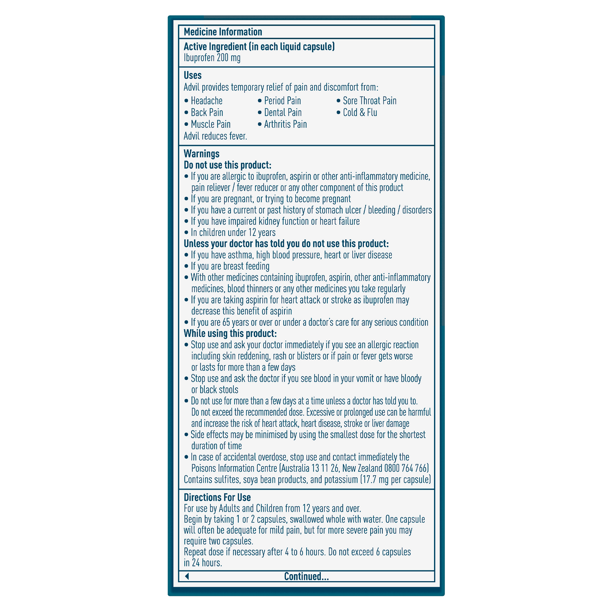 Advil Liquid Capsules contain a liquid form of ibuprofen inside a soft capsule shell. Because it is a liquid, Advil is absorbed into your system fast, rushing relief to where you need it most. Advil Liquid Capsules work locally at the site of pain, effectively relieving pain where inflammation is present and reducing fever.