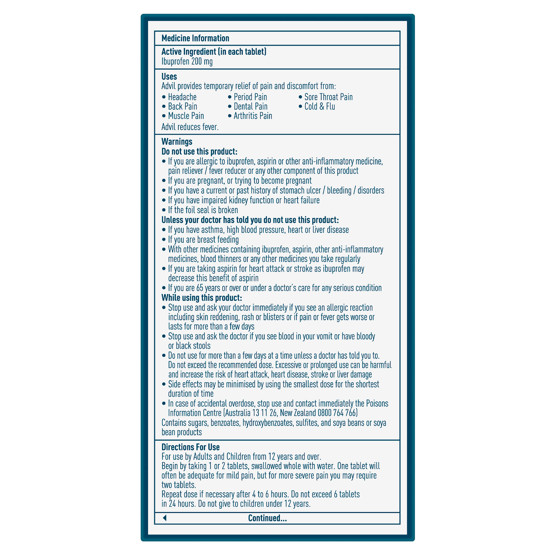 Advil Tablets provide effective pain relief at great everyday value. Each Advil Tablet contains 200mg ibuprofen and is a round, sugar coated tablet that is easy to swallow. Use Advil Tablets for temporary relief of pain and discomfort from everyday pains and aches. Advil Tablets also reduce fever.