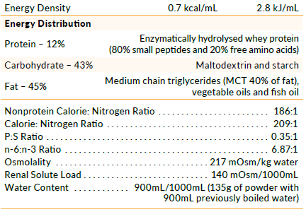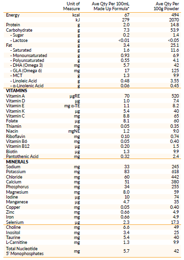 Maltodextrin (Corn), Enzymatically Hydrolyzed Whey Protein (Milk), Vegetable Oils (Palm Olein, Sunflower, Rapeseed, Blackcurrant Seed), Medium Chain Triglycerides (2.5%), Potato Starch, Minerals (Calcium Glycerophosphate, Magnesium Chloride, Sodium Chloride, Potassium Phosphate, Potassium Chloride, Calcium Phosphate, Ferrous Sulphate, Zinc Sulphate, Copper Sulphate, Potassium Iodide, Manganese Sulphate, Calcium Chloride), Emulsifier (E472c), Vitamins [Sodium Ascorbate (Vit C), Dl-Alpha-Tocopheryl Acetate (Vit E), Niacinamide (Niacin), Calcium Pantothenate, Riboflavin (Vit B2), Retinyl Acetate (Vit A), Pyridoxine Hydrochloride (Vit B6), Thiamine Mononitrate (Vit B1), Folic Acid, Phylloquinone (Vit K1), D-Biotin, Cholecalciferol (Vit D3), Cyanocobalamin (Vit B12)], Fish Oil, Taurine, Choline Bitartrate, Inositol, Nucleotides (Cytidine 5’-Monophosphate, Uridine 5’-Monophosphate, Adenosine 5’-Monophosphate, Guanosine 5’-Monophosphate), L-Carnitine. Contains Fish Oil and Milk.