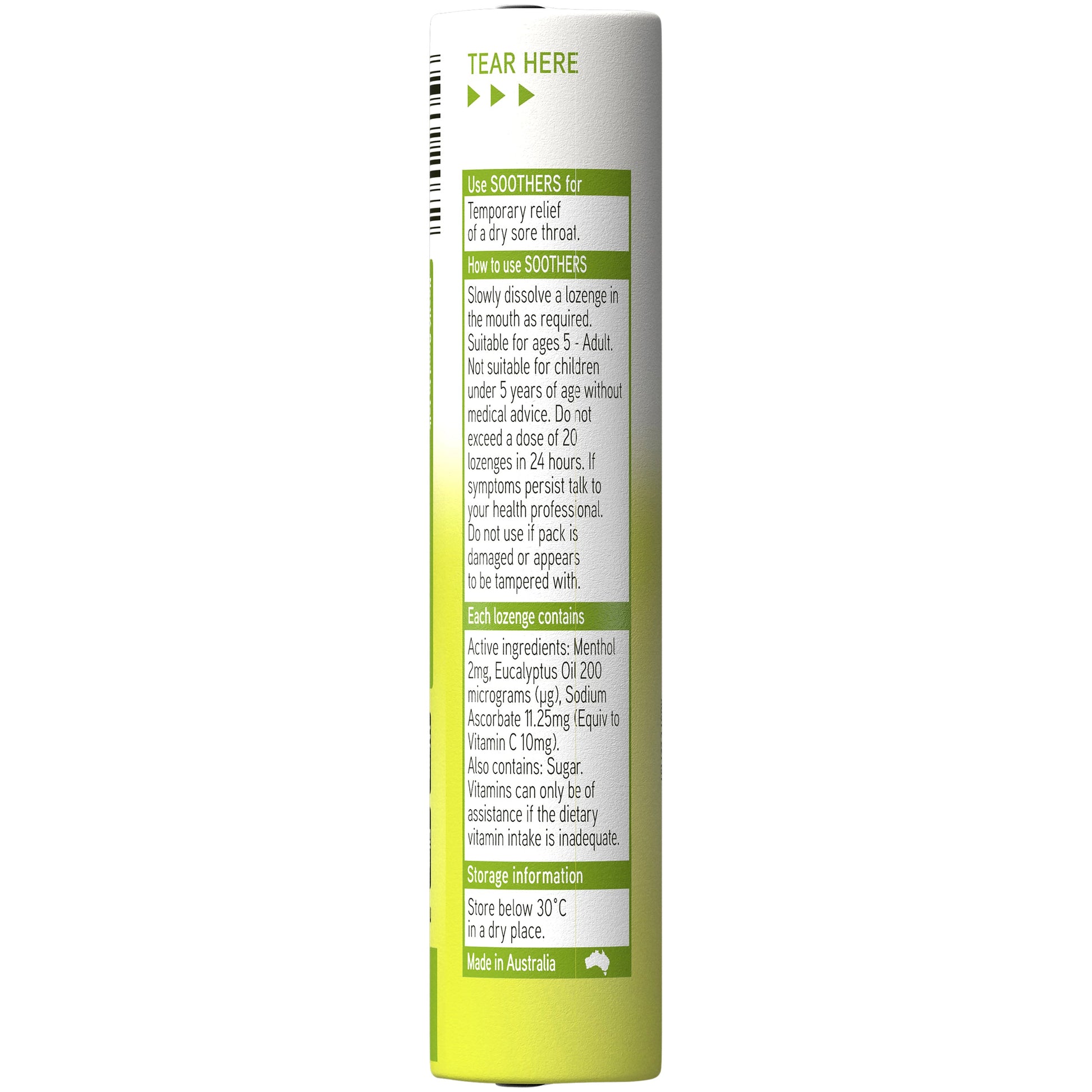 SOOTHERS Liquid Centres Lemon & Lime flavour medicated throat lozenges contain active ingredients Menthol, Eucalyptus Oil and Vitamin C to soothe the throat and clear the nose. They help relieve symptoms of common colds and flu, including dry and irritated throats, and nasal congestion. SOOTHERS Lemon & Lime flavour throat lozenges contain a delicious lemon & lime flavoured centre, no artificial colours, and are proudly made in Australia. Each convenient stick pack contains 10 individually wrapped lozenges, perfect to take on the go.