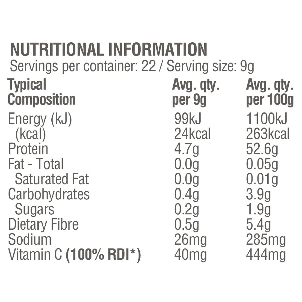 No gluten, added sugar, dairy, additives, preservatives, GMOs & syntheticsContains fish products. - Mix 9g (1 heaped tablespoon) into 300ml of cold water, coconut water or liquid of choice. For optimal results consume 1 serve daily. Also delicious when added to your favourite smoothies, breakfast bowls and raw treats.