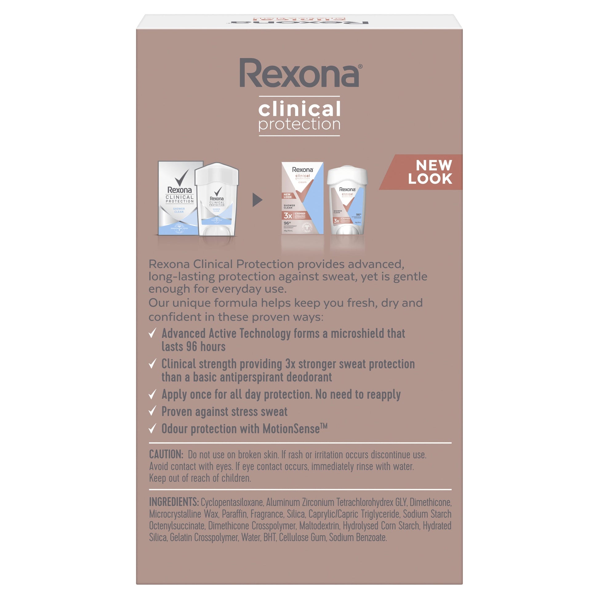 Shower Clean Clinical Protection for women offers up to 3 times more wetness protection than a basic antiperspirant deodorant, yet is gentle enough for everyday use. Keep confident with its fresh fragrance and stay dry with Rexona's most advanced formulation. Our products are intelligently designed to work as hard as you do.