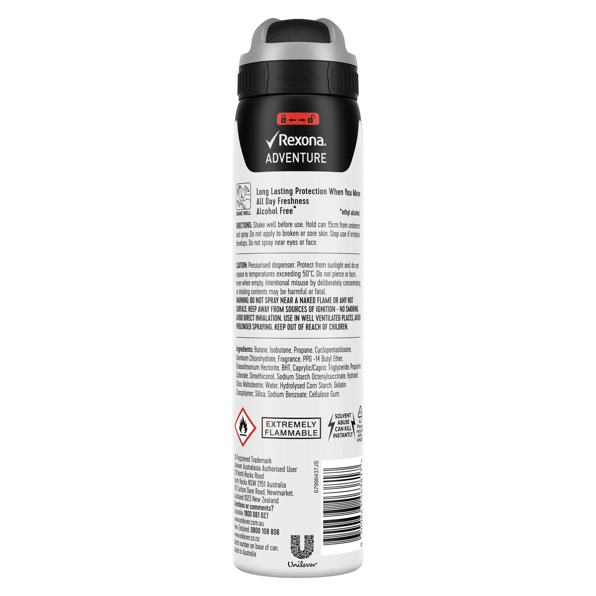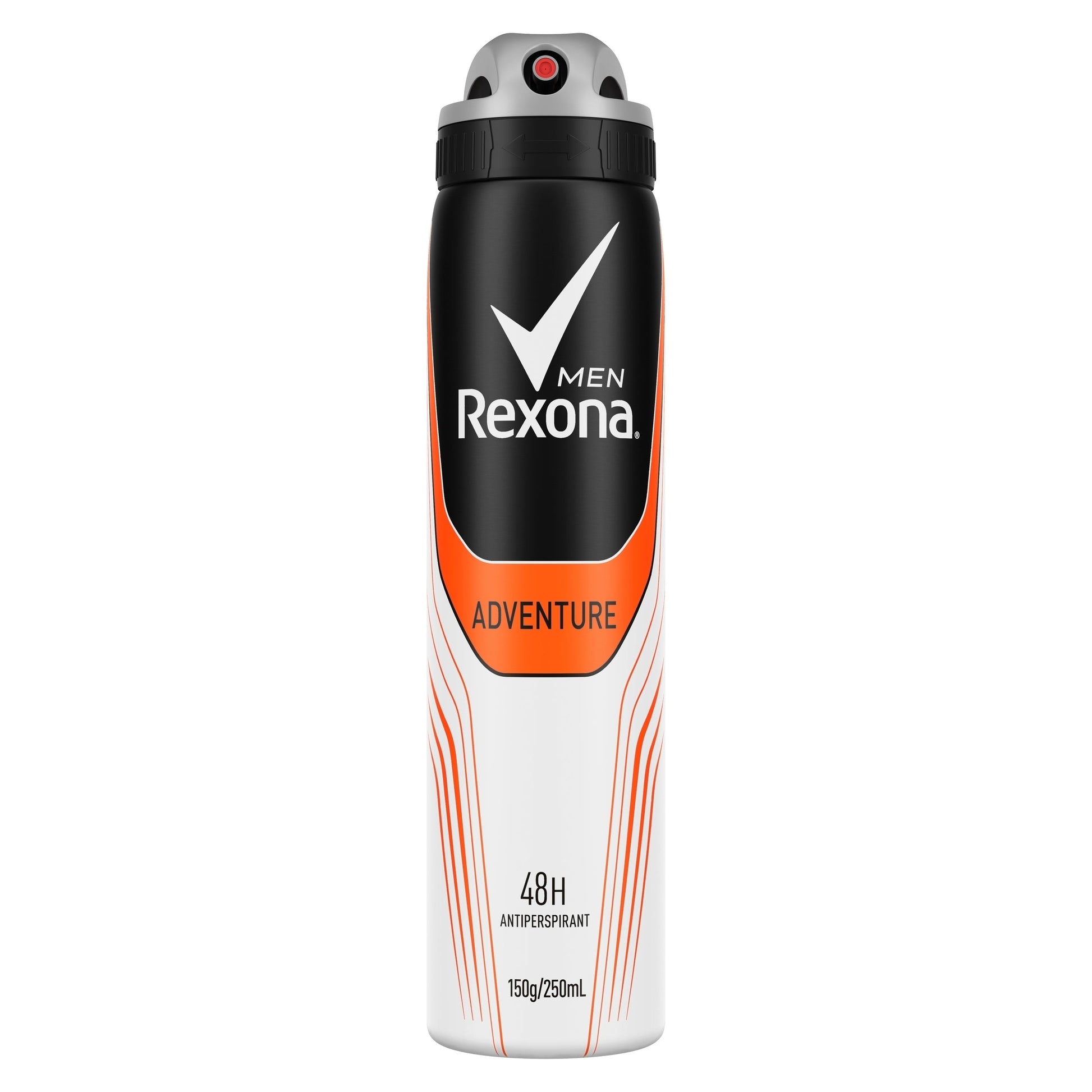 Get bursts of fragrance throughout the day with Rexona's Adventure 250mL antiperspirant deodorant for odour and sweating, which is designed to provide sweat control for up to 48 hours and all day odour protection.Our products are intelligently designed to work as hard as you do. We make it our business to know more about sweat, and what we learn informs every product innovation.Sweat, also known as perspiration, is a normal and healthy bodily function and it starts to occur just a few months after birth.