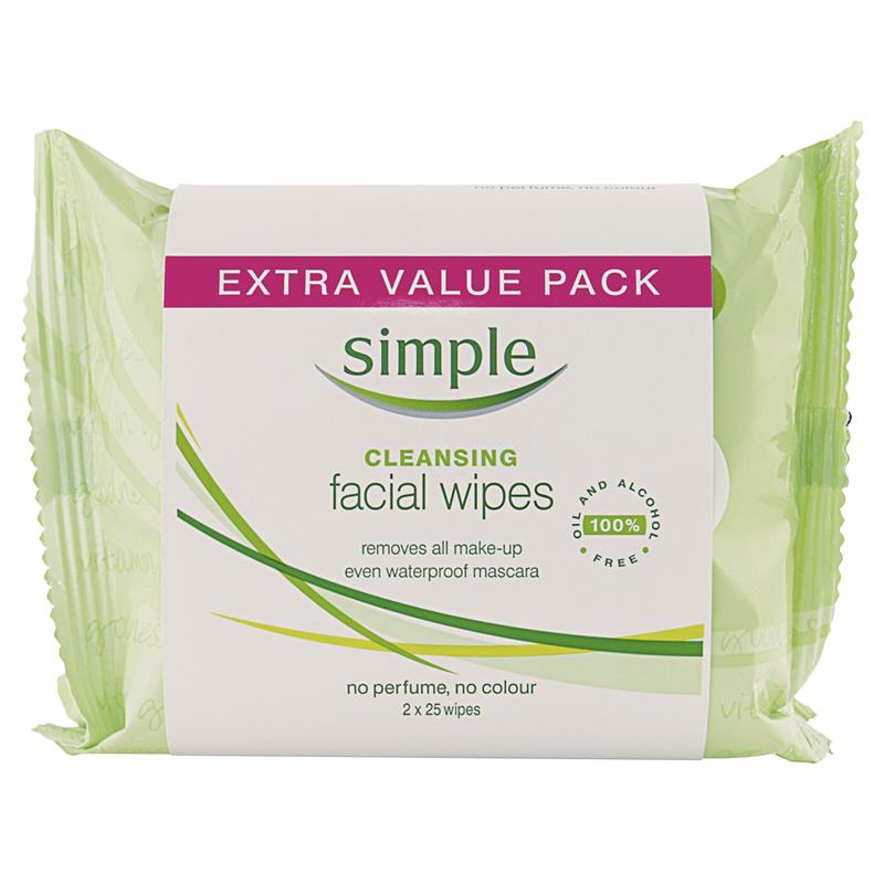 Softer than silk and merciless on makeup, our Simple® Kind to Skin Cleansing Facial wipes is a gentle cleanser that lifts away grease, impurities and make-up effectively, even waterproof mascara. Your go to makeup wipes are convenient, quick-to-use and make the perfect addition to any makeup bag, gym kit and bathroom to give a gentle cleanse or touch-up for naturally healthy-looking skin every day wherever you are. Our face wipes do not dry out, irritate skin or leave a greasy residue, they're great to use as makeup remover wipes or part of your daily, day or night cleansing routine. And what's more, your skin is left feeling thoroughly clean, fresh and instantly hydrated. Our Simple wipes® are made of softer than silk fibres, gentle cleansers, purified water and skin-loving ingredients such as Vitamin B5 and Vitamin E. Simple® Face Wipes are unscented and contain no artificial perfumes and no harsh chemicals that can upset your skin, perfect for sensitive skin.. Every wipe is as fresh as the first, thanks to our aqua-lock™ technology which helps prevent the face cleansing wipes from drying out so every wipe stays fresh and effective, even the last one. Our wipes are dermatologically tested and approved, not forgetting hypoallergenic too. For best results and how to apply: Cleanse day and night by gently wipe Simple Kind to Skin Facial Cleansing Wipes over eyelids, face, neck and even lips to cleanse the skin. Mascara won't budge? Hold the wipe over stubborn areas for a few seconds before wiping. Stop your facial wipes drying out by remembering to reseal the pack. Throw used facial wipes in the bin; DO NOT FLUSH. The environment will be thankful for it.Boxed Contents: Twin Pack 50 Wipes
